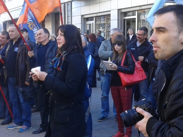 Zastave sindikata Nezavisnost ispred prostorija Radio-televizije Kragujevac. Na protestu na kom je bilo šezdesetak ljudi govorili su sindikalni funkcioneri i novinari koji pet meseci nisu primili zarade. Bašte kafića, tik