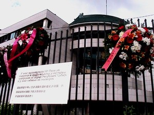 Kineski ambasador Džang Van Su, predstavnici Udruženja novinara Srbije (UNS) i dopisnici kineskih medija iz Beograda položili su juče vence na mestu srušene zgrade kineske ambasade, u kojoj je 1999.