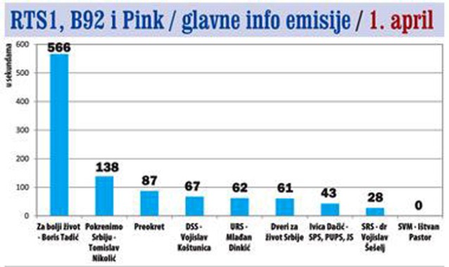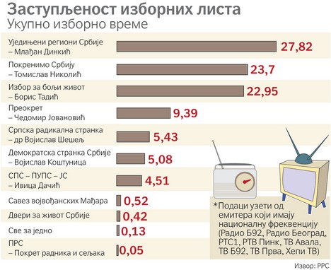 Na stanicama s nacionalnim frekvencijama, lista URS-a bila je najzastupljenija kada je reč o ukupnom vremenu posvećenom izborima, iza njih je lista „Pokrenimo Srbiju”, koju predvodi Tomislav Nikolić, a na