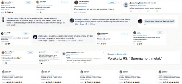 „Spremamo ti metak”, „Lagana smrt svim komunističko-levičarskim srbima”, „J… ti sve živo i mrtvo ološu raspali”, “…ko te napravi tako retardiranog i raspalog, a ipak dovoljno „empatičnog” za sve doznake
