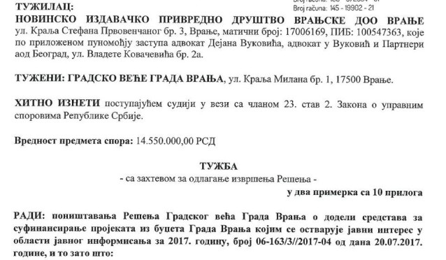 Novinsko-izdavačko preduzeće Vranjske d.o.o. tužilo je Gradsko veće Grada Vranja Upravnom sudu u Beogradu, tražeći poništenje rešenja tog gradskog organa o dodeli sredstava za sufinansiranje projekata iz budžeta Grada kojim