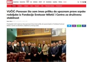 „Ponosan što sam imao priliku da upoznam izuzetno obrazovane ljude i prave srpske rodoljube iz Fondacije Svetozar Miletić i Centra za društvenu stabilnost iz Novog Sada. Razgovarao sam sa njima o aktuelnoj geopolitičkoj situaciji, mnogo toga naučio i zamolio ih da svojim znanjem pomognu jedinoj državi koju imaju i koju beskrajno vole – Srbiji”, napisao je Aleksandar Vučić na Instagramu u januaru 2023. godine, uz fotografiju na kojoj su i Nemanja Starović, i Predrag Rajić, ali i Miloš Vučević.
