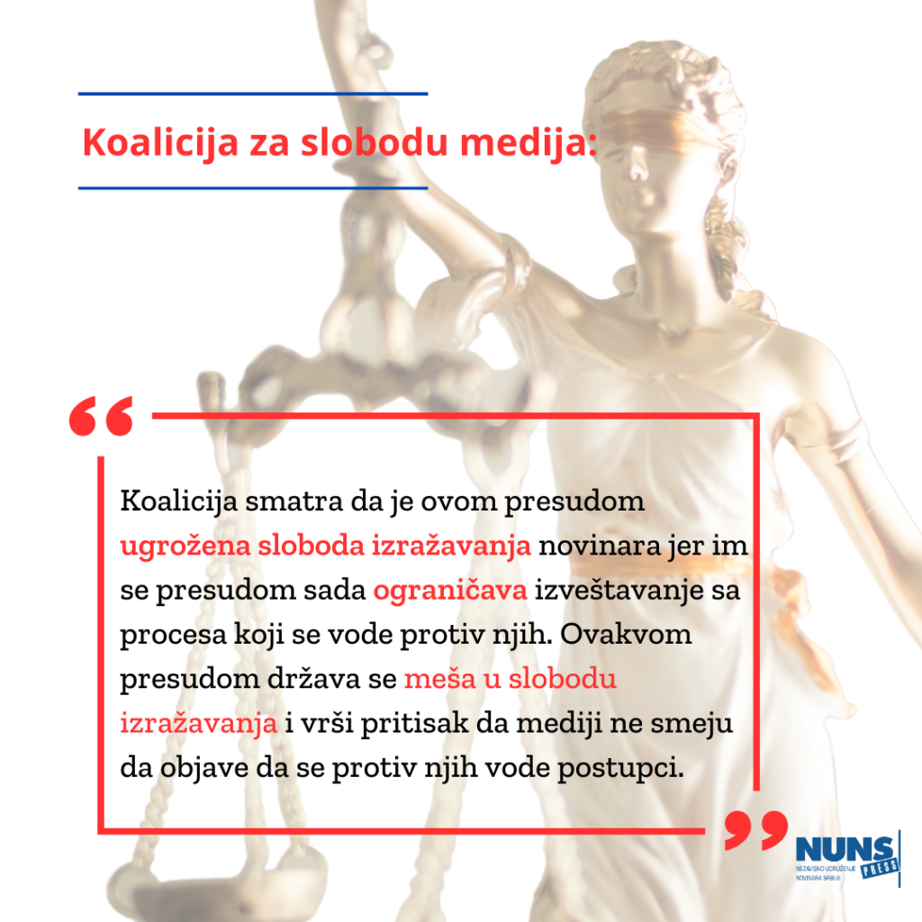 Koalicija ističe da je ovom presudom ugrožena sloboda izražavanja novinara jer im se presudom sada ograničava izveštavanje sa procesa koji se vode protiv njih. Koalicija smatra da se ovakvom presudom država meša u slobodu izražavanja i vrši pritisak da mediji ne smeju da objave da se protiv njih vode postupci.