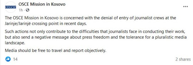 „Medijima treba omogućiti slobodno kretanje i objektivno izveštavanje“, piše u saopštenju Misije OEBS na Kosovu.