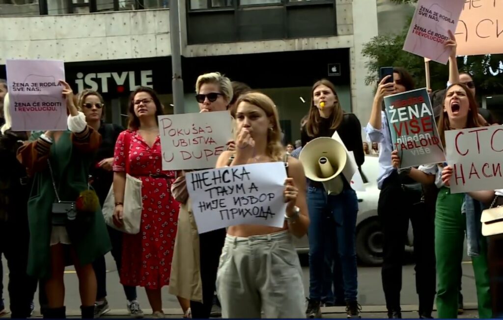 Demonstrantkinje nose transparente „Ženska trauma nije izvor prihoda“, „Želimo ti žensku revoluciju“, „Nijedna više“.