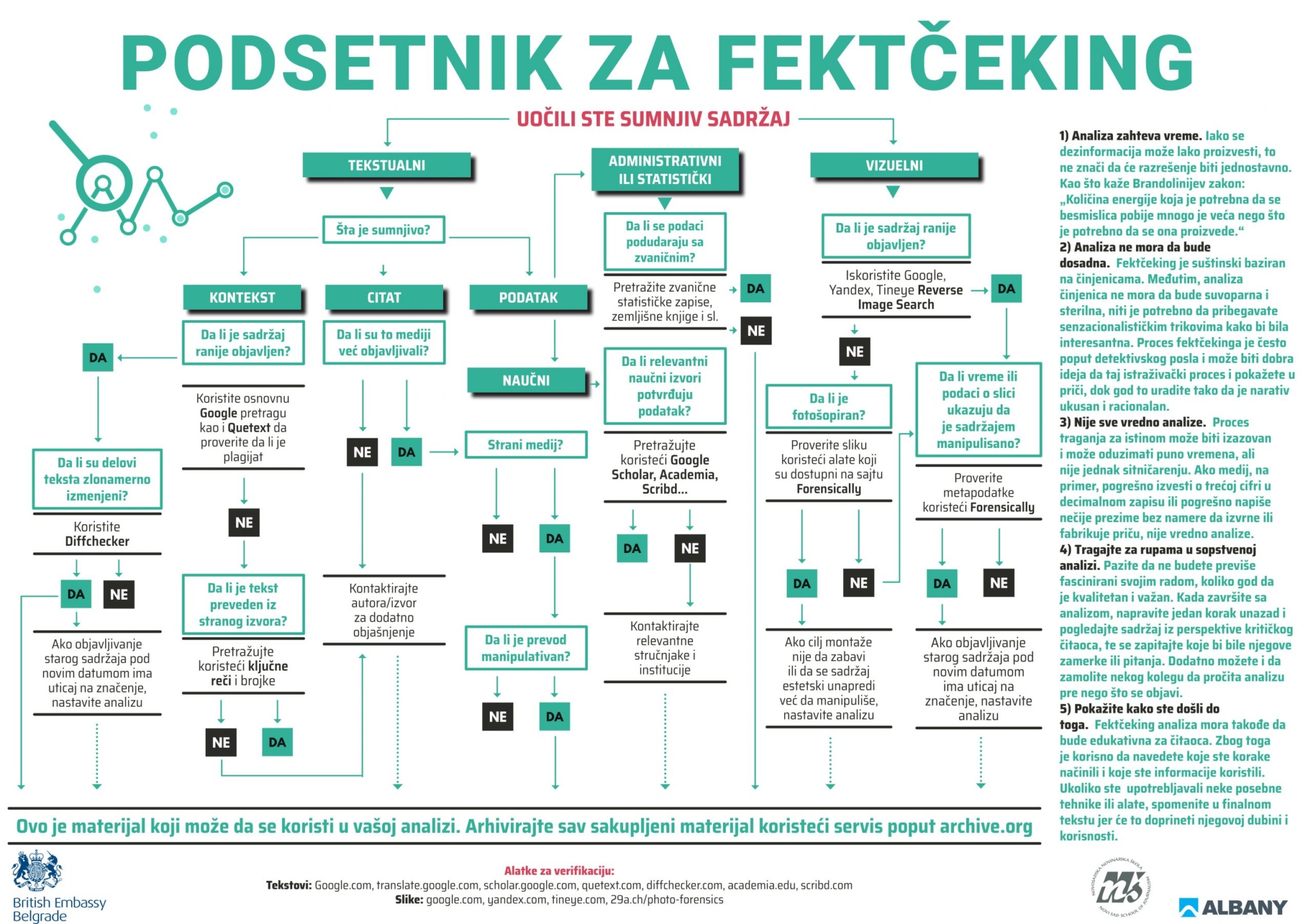 Provera informacija jeste oduvek standard u novinarstvu, ali, sa onlajn trendovima koji se brzo menjaju, provera onlajn sadržaja nekada može zahtevati dodatne korake. Upravo ti koraci ilustrovani su u posteru koji je pred vama.