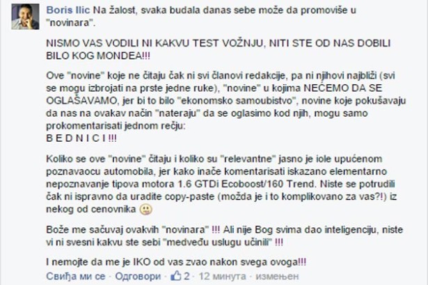 Javne uvrede, optužbe za falsifikat, ucenjivanje, pretnje, omalovažavanje i grubo lično vređanje novinara i novinarske profesije ovog puta su prevršile svaku meru. Dve decenije našeg novinarskog rada, hiljade testiranih vozila stale su u opštu formulaciju BEDNICI. Da stvar bude još gora, zvanični Ford u Srbiji je zabio glavu u pesak i ćuti. Tajac! Arogancija bez presedana? Ili nepoznavanje PR profesije? Svejedno! Jer da se ovo desilo u bilo kojoj poslovnici Forda u svetu, ponedeljak bi na birou rada bio „bogatiji“ za dve osobe.