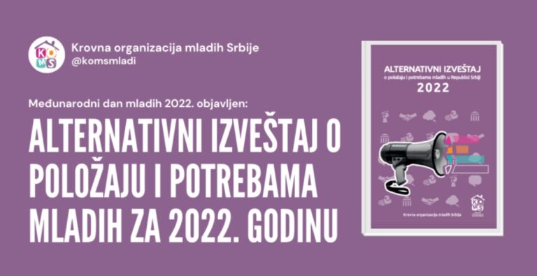 Krovna organizacija mladih Srbije (KOMS) objavila je šesti Alternativni izveštaj o položaju i potrebama mladih u Srbiji za 2022. godinu, koji je predstavila danas, na Međunarodni dan mladih. KOMS je kroz poglavlje